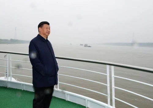 2018年4月,习近平总书记来到湖南岳阳城陵矶水文站考察。在狭窄的站房外长廊上,习近平总书记举目远眺。“共抓大保护,不搞大开发”的战略定力,在这里化作守护一江碧水的坚定行动。