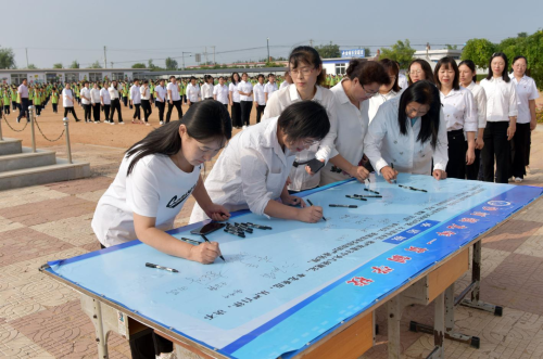 教师在师德师风承诺书上签字 弘雅环境,一草一木皆育人 走进教学楼便能体会到学校的特色文化氛围。孝德、美体、技学、中国梦的别具匠心的楼廊文化,新二十四孝图、长城高山风景画、育人标语、交通安全常识教育等,学校建设净化、绿化、美化、亮化的校园环境。种植了梧桐树、桃树和葫芦,寓意着“梧高凤自来”“桃李满天下”“福禄绵延”。